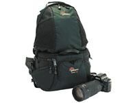 Helt suverän comboväska som passar till både resan (går som handbagage på flyget) och dagslånga fotoutflykter i stad och natur. Funkar bra som vanlig axelväska för kameran, men även som midjeväska samt ryggsäck där "säck-delen" rymmer extra kläder/mat/dryck el dyl. Har inbyggt regnskydd som går att dra fram över kameradelen. Rymmer systemkamera med inte allt för skrymmande objektiv samt 4 extra objektiv (<22 cm långa) eller andra prylar. Tre yttre småfickor samt en inre och en yttre lockficka (den yttre nås bara då inte ryggsäcken sitter på).