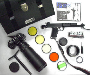 Helt vansinnig kamera egentligen. En Zenit 12 med TAIR 300 mm optik som är fastsatt på en gevärskolvliknande anordning. Bilden tas genom att avtryckaren avfyras.