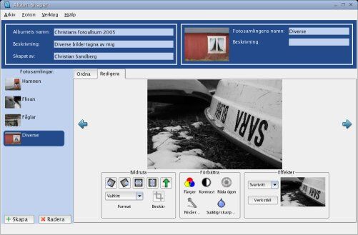 Du kan bl a beskära, göra bilder svartvita, justera ljusstyrka/kontrast och skärpa upp bilder.
