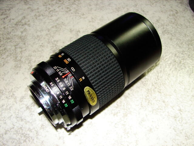 Fast 200mm glugg från tokina till Minolta M/MD fattning. och ett utdragbart motljusskydd.