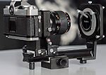 Autobellows AR var Konicas mest sofistikerade bälg passande AR bajonettfattning. Plastguidrar och inbyggd kuggstång justerar bälgen på rälsen smidigt och exakt. På bilden ses även Konicas Macrostand ...Läs mer