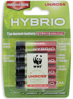 Uniross kommer nu med en ny NiMH-teknologi som förenar de alkaliska batteriernas livslängd och enkelhet med de laddbara batteriernas ekonomi och kapacitet. Uniross Hybrio batterier kännetecknas av: