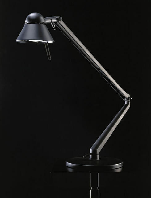 Tvåledad skrivbordslampa med tung fot och även tvingfäste för att skruva fast.