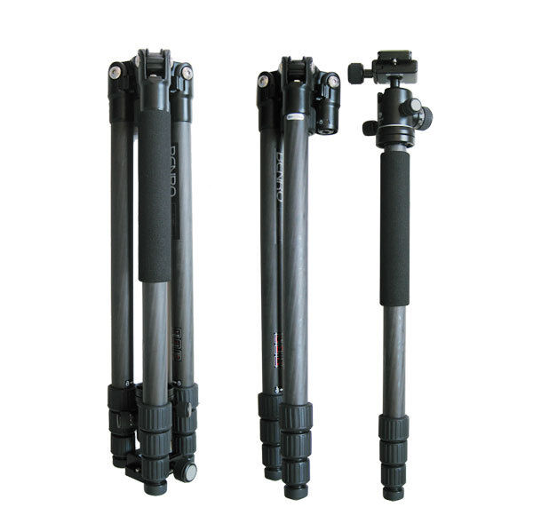 Kolfiberstativ med fem sektioner och vridlåsning. Ett av benen går att skruva av och användas som monopod.