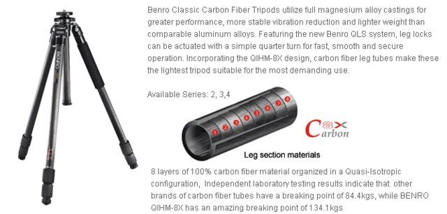 Ett flexibelt och stabilt stativ tillverkat av 8-lagers kolfiber. Gummerade låsdelar på bensektionerna. Benen kan låsas vid tre olika vinklar. Stativet är utformat för professionella systemkameror med längre objektiv. Stativet har ett gummerat ben. På fötterna kan man sätta dit spikfötter. Mittpelaren har en krok i botten för att hänga en vikt i vid stark vind. Pelaren kan tas ur och monteras uppochner. Standard stativhuvudgänga. Lull-lull i form av libell och kompass på spindeln som är gjord i magnesium/aluminium.