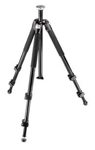 Mycket stadigt trebent Manfrotto-stativ med två teleskopsektioner och snäpplås. Två av benen är utrustade med benvärmare i foam-material och det medföljer gummifötter med utskruvbara spikes.